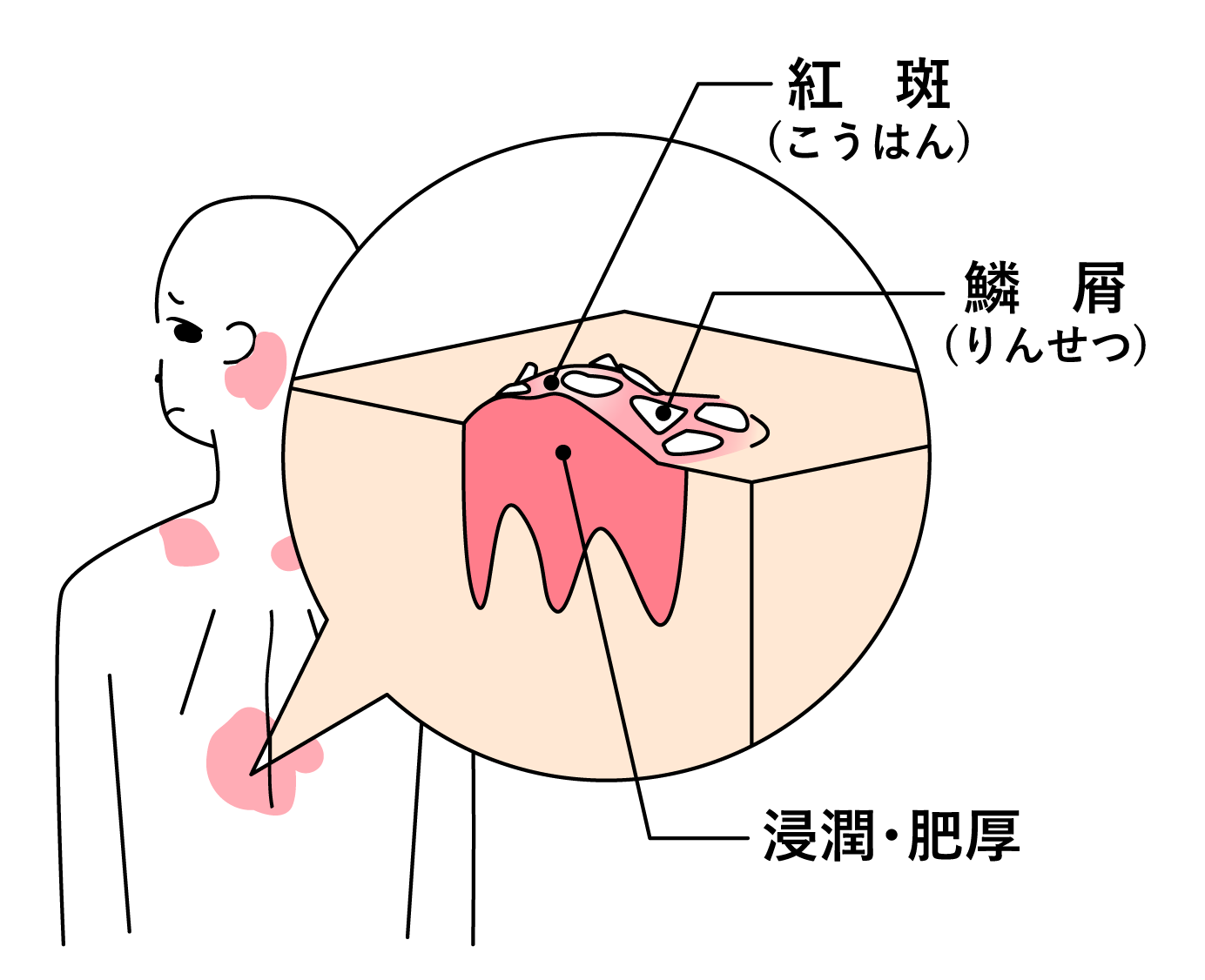 1:紅斑(こうはん)赤い斑のような状態が皮膚に現れます。2:浸潤・肥厚皮膚が盛り上がります3:鱗屑(りんせつ)皮膚がカサカサした状態になり、白く粉がふいてきます。※粉が落ちてくる状態は落屑(らくせつ)と呼ばれます