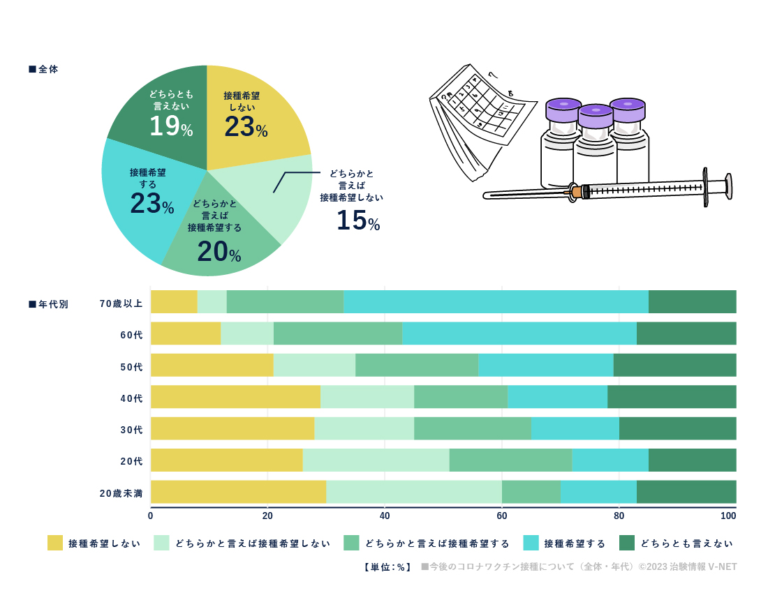 20歳未満から40代までは「接種希望しない」の回答割合が多いですが、50代以降になると「接種希望する」の回答割合が多い結果となりました。