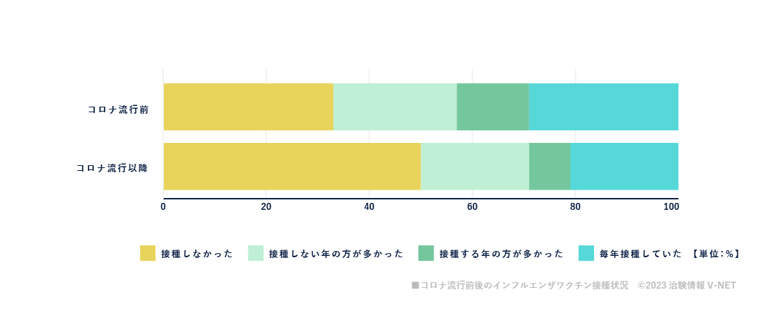 コロナ流行以降、インフルエンザワクチン接種をしていない方が増えているという結果になりました。コロナ流行以降間もないころは外出する機会も減りインフルエンザワクチン接種を控えた方もいらっしゃるのかもしれません。