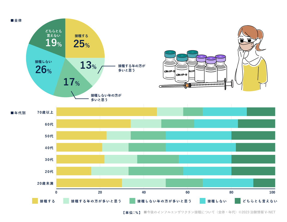 学校等での流行を懸念して20歳未満の方は今後もワクチン接種を検討しているのかもしれません。60歳以上になるとインフルエンザワクチン接種費用の助成を行っている自治体も多いので、それを利用して今後も接種しようと考えている高齢者が多いのかもしれません。