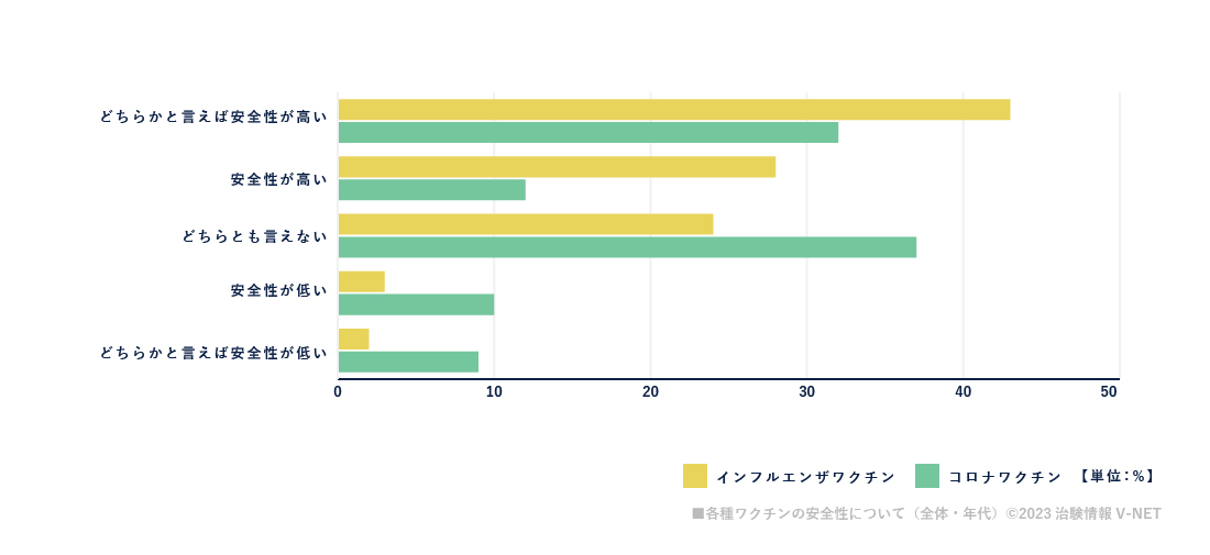 インフルエンザワクチンでは「安全性が高い」28%(1,066票)、「どちらかと言えば安全性が高い」が43%(1,628票)に対してコロナワクチンでは「安全性が高い」が12%(464票)、「どちらかと言えば安全性が高い」が32%(1,222票)でした。