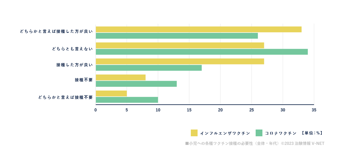 小児(17歳以下)へのワクチン接種についてコロナワクチンは「どちらとも言えない」が34%(1,293票)、インフルエンザワクチンは「どちらかと言えば接種した方が良い」が33%(1,260票)の回答が多い結果となりました。